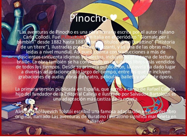 La mayoría de las historias que conocemos gracias a las producciones de disney son mucho más crudas en sus versiones originales. La verdadera historia de pinocho. El gato y el zorro cuelgan a pinocho (y se le considera muerto). Pinocho también tiene sus necesidades.