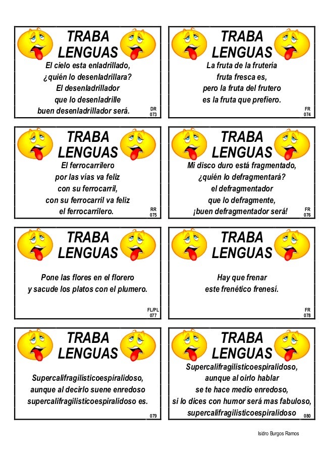 SPANISH TONGUE TWISTERS - TRABALENGUAS - Language Hub from languagehub.co.nz • pablito clavó un clavito. Existen diversos ejemplos de trabalenguas, que son de gran utilidad para mejorar la memoria, permiten resolver ciertos problemas de pronunciación. Trabalengua la lengua me trabalengua la lengua me trabalengua la lengua me tra trabalengua la lengua me trabalengua la lengua me trabalengua la lengua me tra.